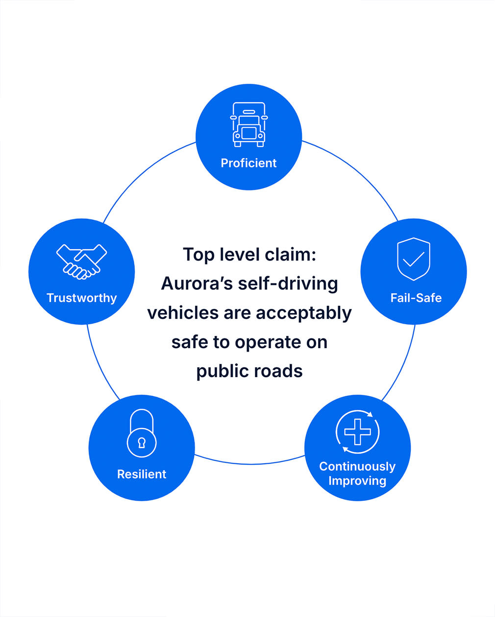 Aurora’s Safety Case Framework is a structured argument composed of hundreds of claims covering the safety of our organization, operations, products, and the development of our technology.